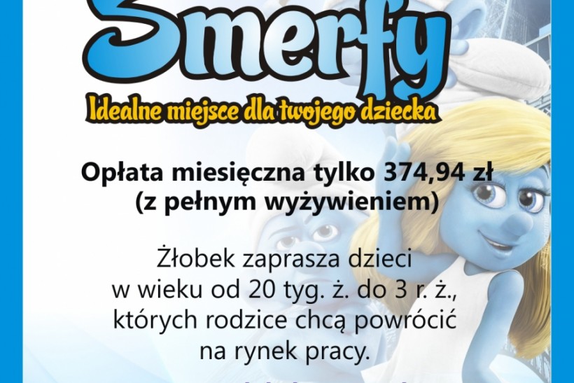 Nowo powstały Żłobek ,,Smerfy '',zaprasza dzieci w wieku od 5 miesiąca do 3 roku . Nasz żłobek mieści się w Myślenicach przy ulicy Żwirki i Wigury 8. Zapraszamy rodziców przebywających na urlopach wychowawczych,macierzyńskich, biernych zawodowo,bezrobotnych,którzy chcą powrócić na rynek pracy. Nasz żłobek to fachowa opieka,dogodna lokalizacja, niskie opłaty,bardzo dobrze wyposażony obiekt,finansowany ze środków unijnych. Zapraszamy do naszego biura przy ul, Żwirki i Wigury 17 (sklep Panaceum).