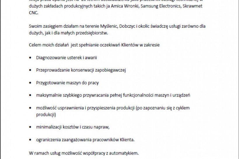 Zajmuję się naprawą i konserwacją maszyn i urządzeń przemysłowych od 20 lat. Wykonuję prace z zakresu mechaniki.