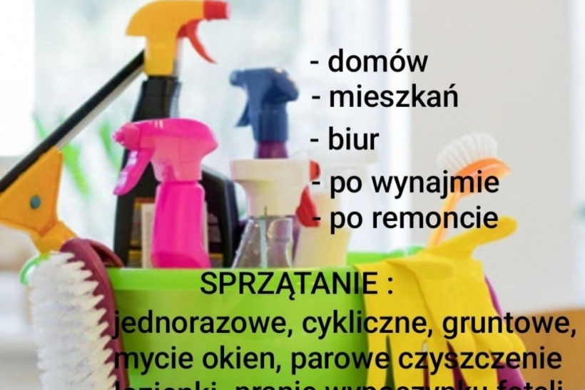 Sprzątanie domów, mieszkań, biur. A także po budowach po remontach, po lokatorach. Umyję okna, odkurzymy każdy przedmiot i wyczyścimy wszystkie zakamarki twojego domu. Do każdego zlecenia podchodzę indywidualnie w zależności od Państwa potrzeb. Używam własnych środków czystości oraz sprzętu. Dodatkowo oferuje usługę prania czyszczenia wypoczynku foteli.Myślenice, Dobczyce , Wieliczka okolice.Zapraszam do kontaktu. wystawiam fakturę